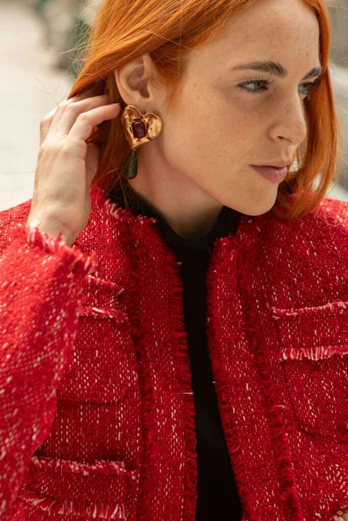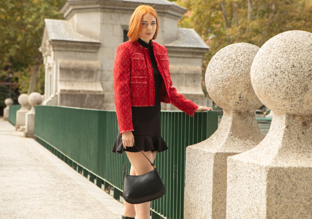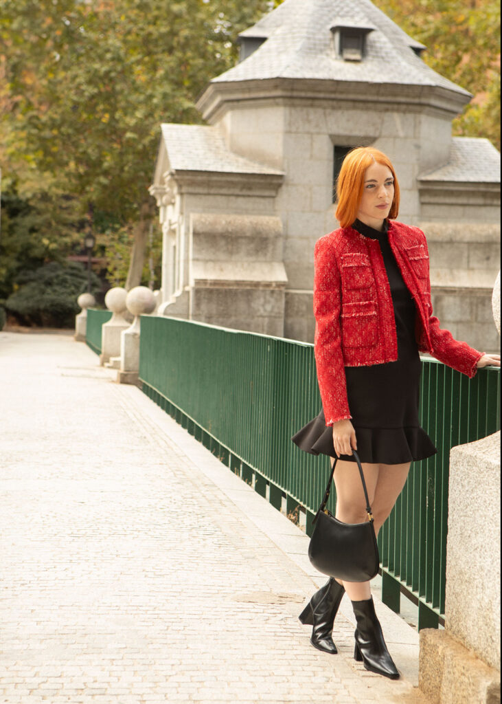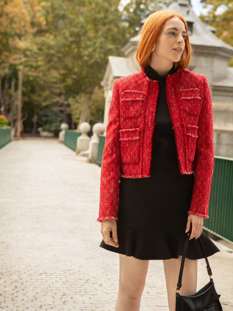 El peplum es una extensión que se le hace a una prenda, suele tener la forma de un volante y formar vuelo, normalmente en la cintura de una prenda (blazer, faldas, blusas…) pero hoy os mostramos cómo queda en un vestido. Mango nos ha sorprendido con este little black dress, o lo que es lo mismo, vestido mini negro, al que le han añadido un peplum al bajo para darle ese toque divertido y diferente a un vestido. Además, lo hemos combinado con una chaqueta de tweed rojo que no puede ser más bonita y queda impresionante con el vestido cortito, la combinación perfecta para cuando quieres ir sencilla pero con un toque fuerte y con estilazo. Os dejamos los detalles de las prendas más abajo y así sabréis dónde conseguir este precioso look 😉 ¡Nos leemos!