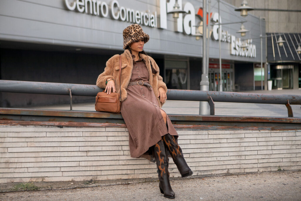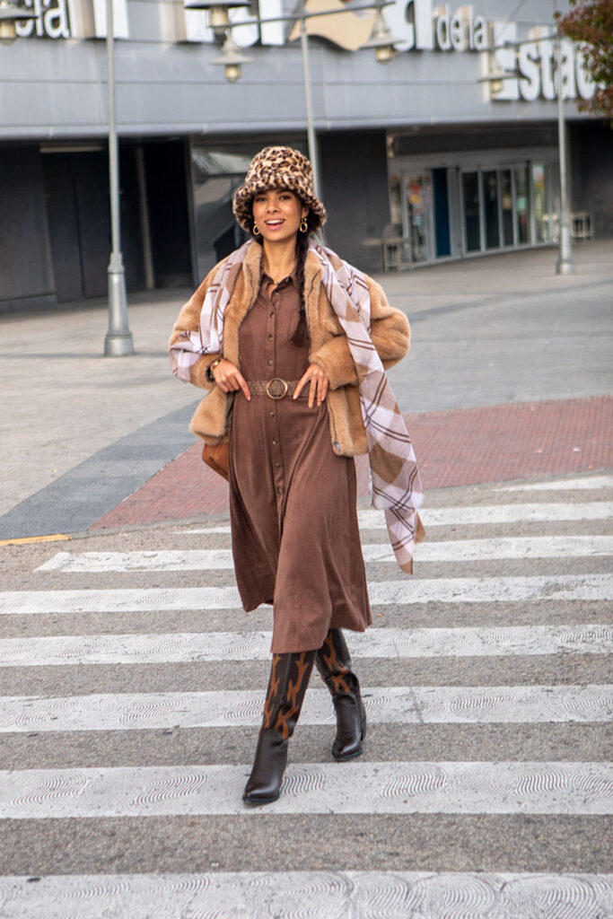 El tejido de «pelito» que todos los años vemos en esta temporada y que nunca deja de llevarse, ese tejido es el que nos ha enamorado hoy. Un día nublado, frío y gris se merece un look que aporte color, alegría y sobre todo abrigue. Por ello hoy os hemos preparado un conjunto que solo con verlo ya sientes lo calentito que es y encima, enamora: vestido de pana, abrigo de pelo, buenas botas, gorro y preciosos complementos. Hablando de este gorro, seguimos con la tendencia del animal print, del leopardo en este caso, que le pude dar un toque guay a un total look negro por ejemplo o puede completar un look en todos marrones y tierras como es el caso. Todas las prendas están perfectamente en armonía y aunque no sean del mismo tono, demostramos que sí se pueden utilizar prendas del mismo color y obtener un buen look para un buen día. A nosotras nos ha encantado y esperamos que a vosotr@s también 😉 Os dejamos los créditos más abajo y ya sabéis… ¡nos leemos!